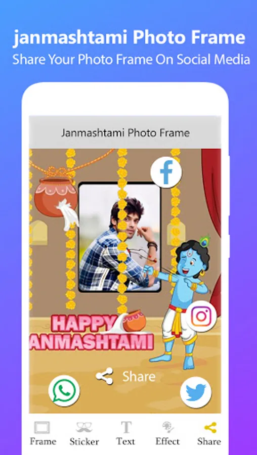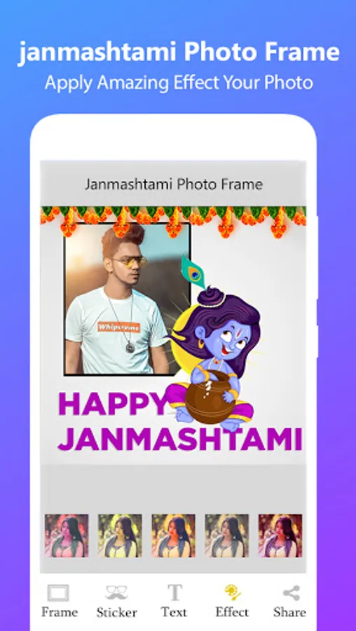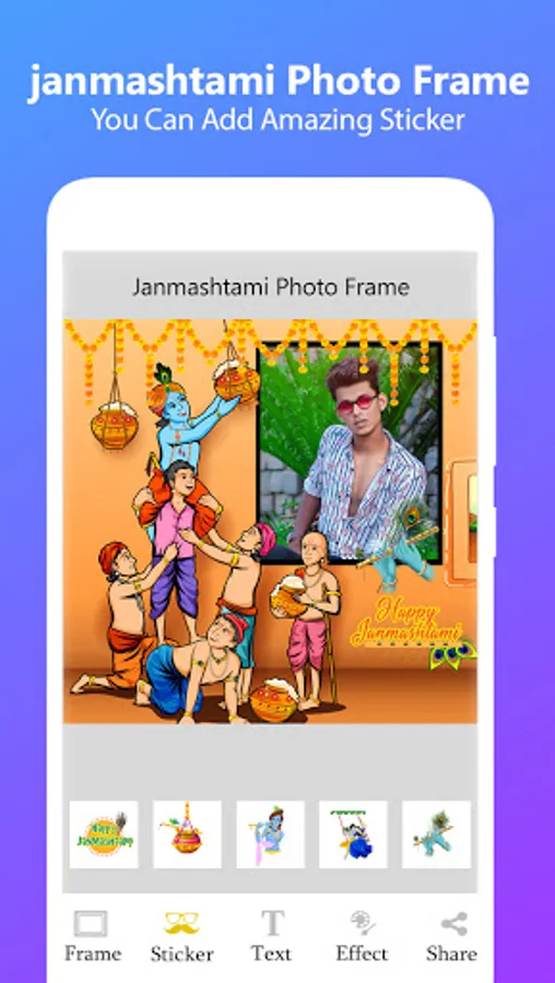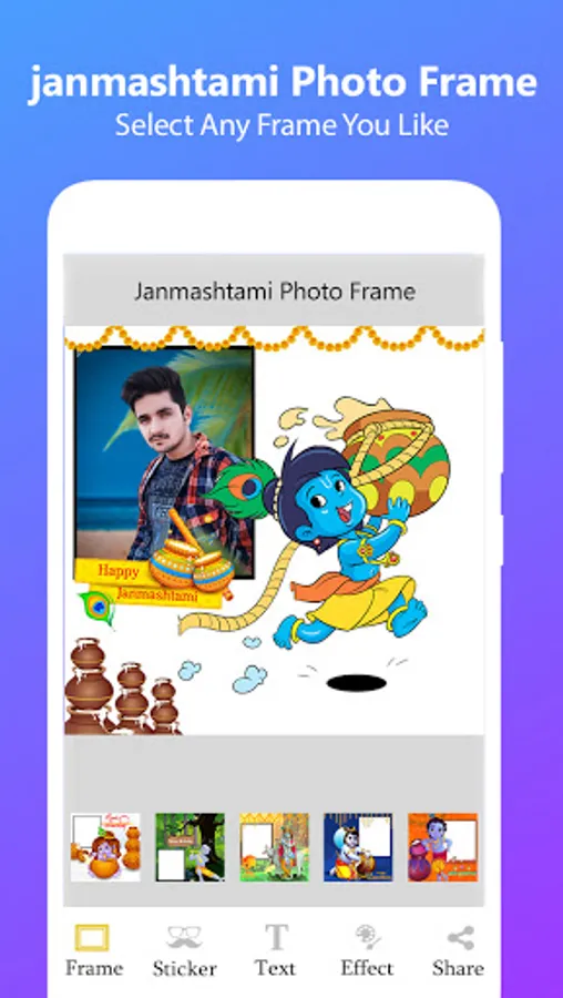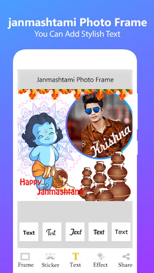 Create magnificent photo montages with Lord Krishna and share them this Janmashtmi. Krishna Photo Editor with Text app brings in the notion of playful and childish background photo frames and realistic and interesting Lord Krishna stickers for creating voguish and unique photo montages.