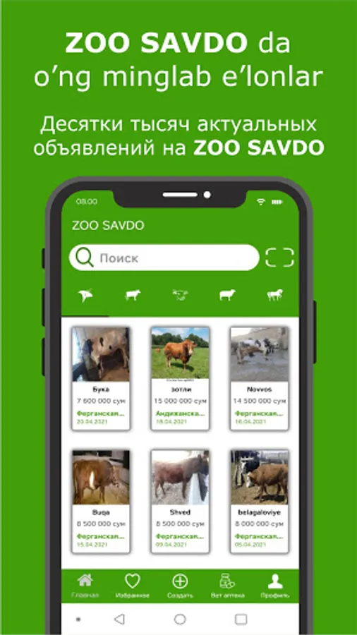 ZOOSAVDO is the largest, most convenient internet market in the agricultural sector. In this market you can sell or buy cattle, sheep, horses, dogs, fish, feed, plants and veterinary medicine. ZOOSAVDO is a new market. Download the ZOOSAVDO app and use the services for free. It's easy with us.