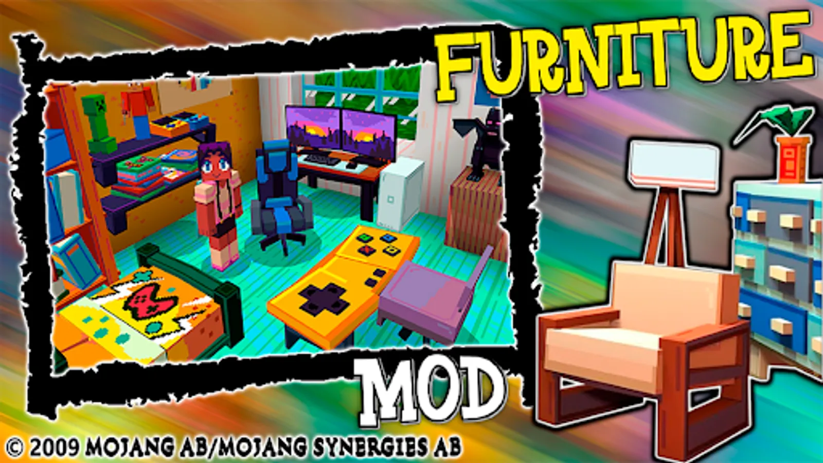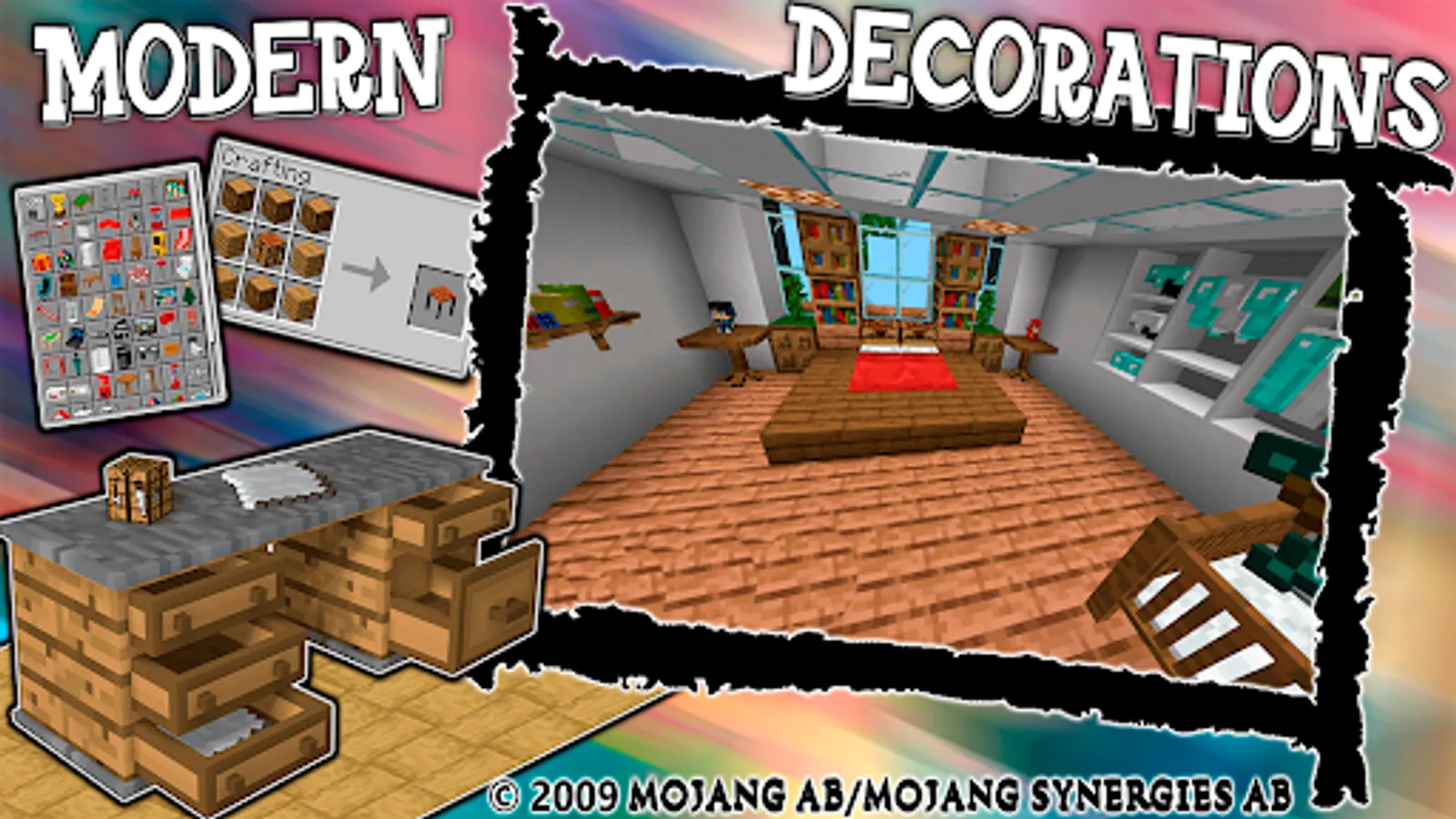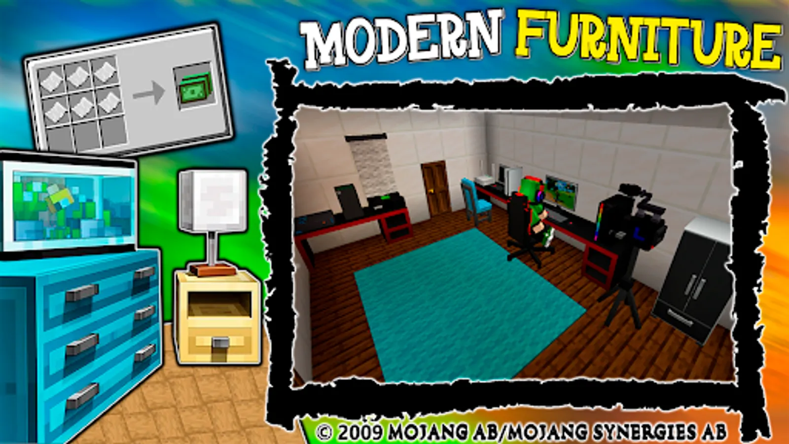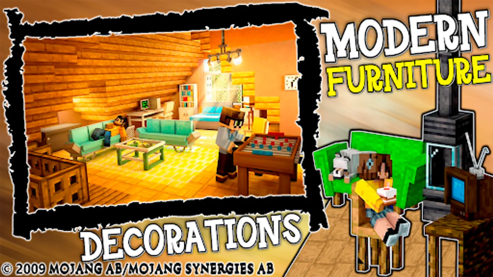1. Furniture Mod for MCPE (This is the Pixel Working Furniture Mod Craft for PE Blocks Game. This Furniture Mod adds over 160 blocks and several of these blocks are functional. Here is a short list of added items: Armchair(with different color variations), TV stand, Worknig TV, Sofa, Shower, Mirror, Toilet, Fridge, Stove, Coffe machine, microwawe, Monitor, Gaming chair, laptop, notebook, phone and a lot of other decorations, furniture and working gadgets.).