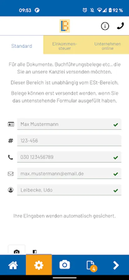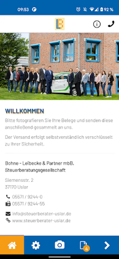 With the help of this app you can send receipts, documents and other correspondence quickly, safely and comfortably to Bohne - Leibecke & Partner mbB, Steuerberatungsgesellschaft.