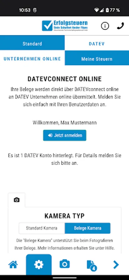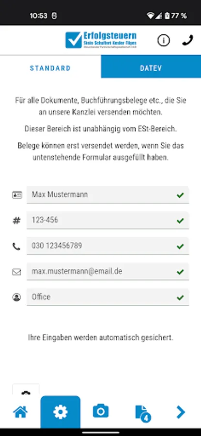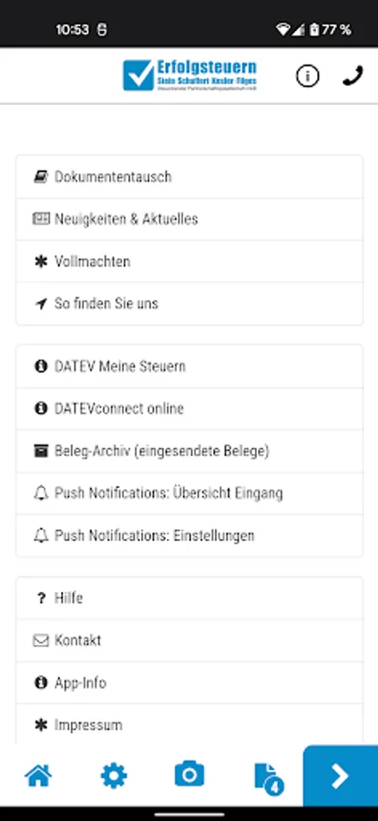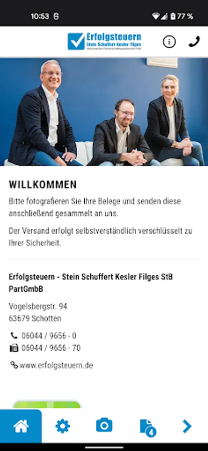 With the help of this app, you can use receipts, documents and other papers to be sent quickly, securely and conveniently to income taxes - Stein Schuffert Kesler Filges StB PartGmbB.