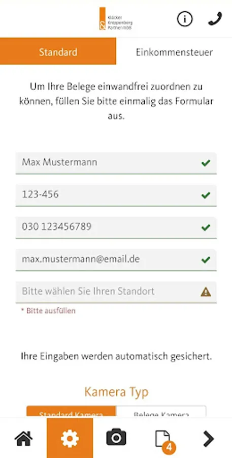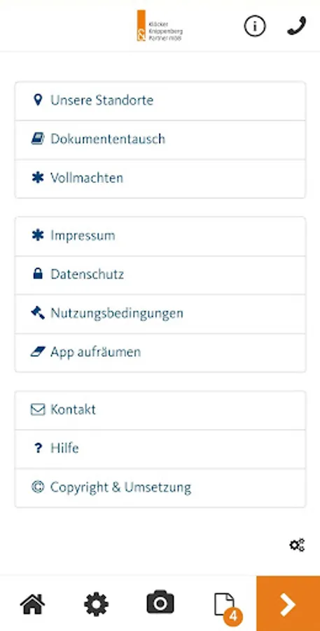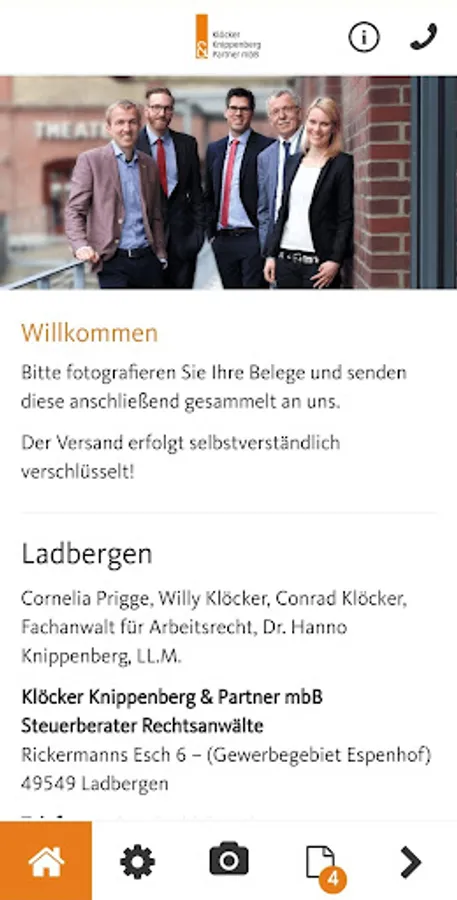 Using this app may be sent to the Klöcker Knippenberg & Partner MBB Tax Services Lawyers receipts, documents, and other documents quickly, safely and comfortably.