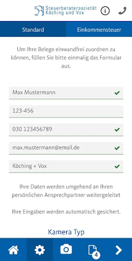 Use the app You can mount your receipts, documents and fast, safe and convenient to send to the tax office Köching + Vox.