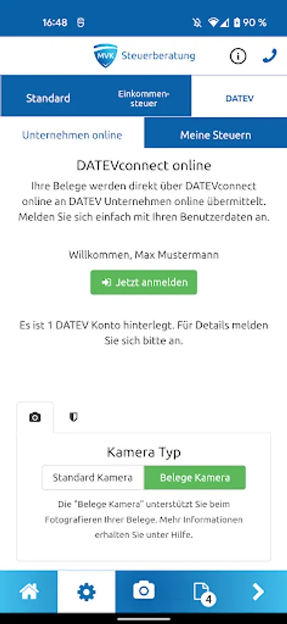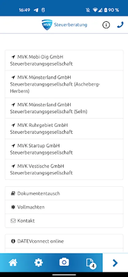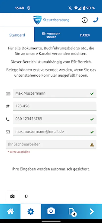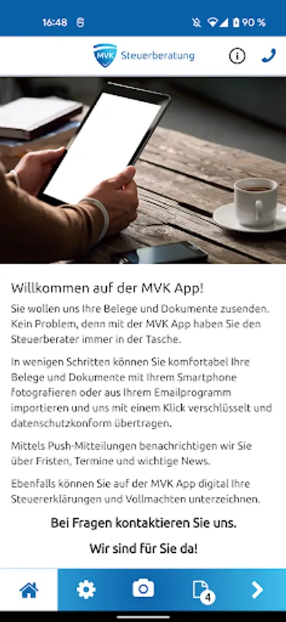 The MVK app provides fast and secure communication between the client and MVK tax advice. With the help of the MVK app, the client can easily and conveniently send receipts, documents and other correspondence to MVK Steuerberatung.