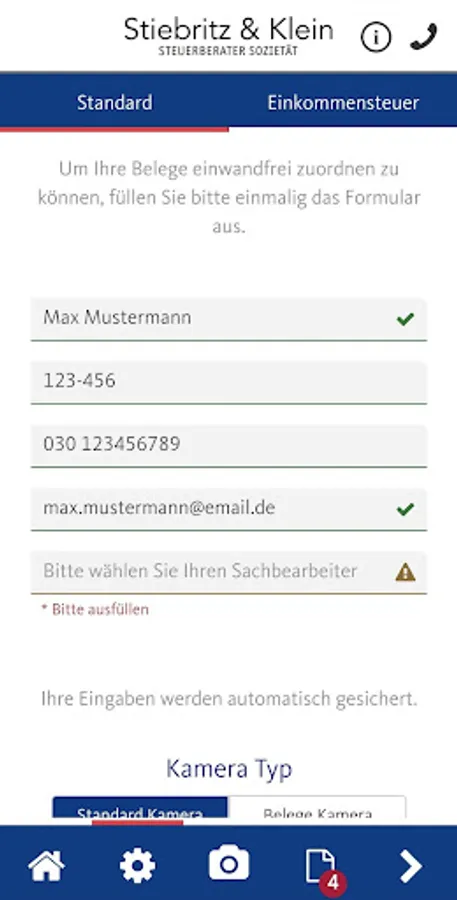 With the help of this app, receipts, documents and other documents can be sent quickly, securely and conveniently to the tax consultant Stiebritz & Klein. Simply take one or more photos of the receipts and send them with one click directly from the app to your clerk at the tax consultant Stiebritz & Klein.