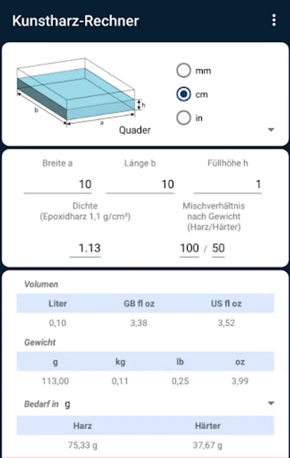 With this Epoxy Resin calculator you have the opportunity to calculate the required amounts of resin, resin / hardener after indication of length, width and height.