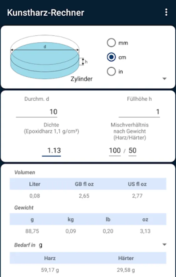 The density is given as 1.13 (epoxy resin), if you want to calculate with another density. There is the possibility to change in the field "resin density" and to calculate according to your resin.