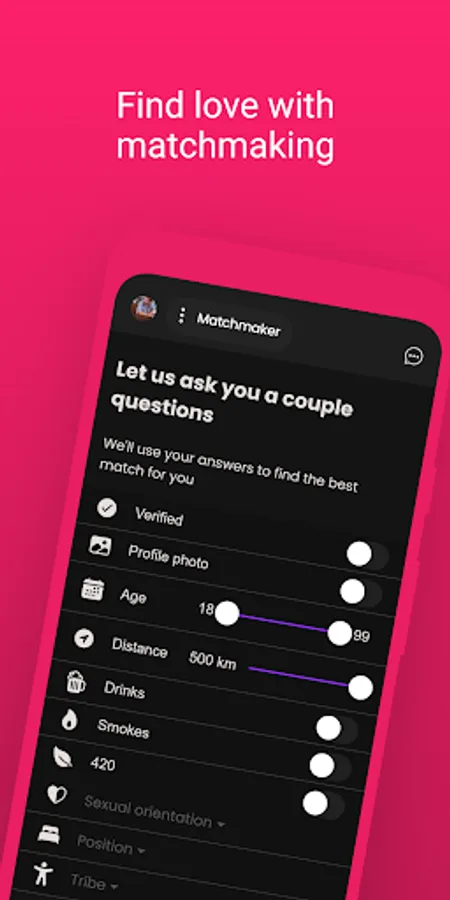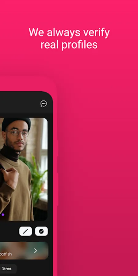 But that's not all, Dimmed also offers an AI Matchmaker to help you find love. The Matchmaker uses cutting-edge algorithms to match you with users who share your interests, values, and desires. Chat in complete privacy, with the ability to save messages, send photos, and share location. Make sure your match is real with Dimmed's Verification feature. This feature helps you avoid catfishing and ensures that you only connect with real people.