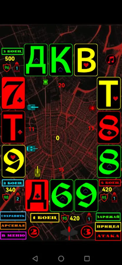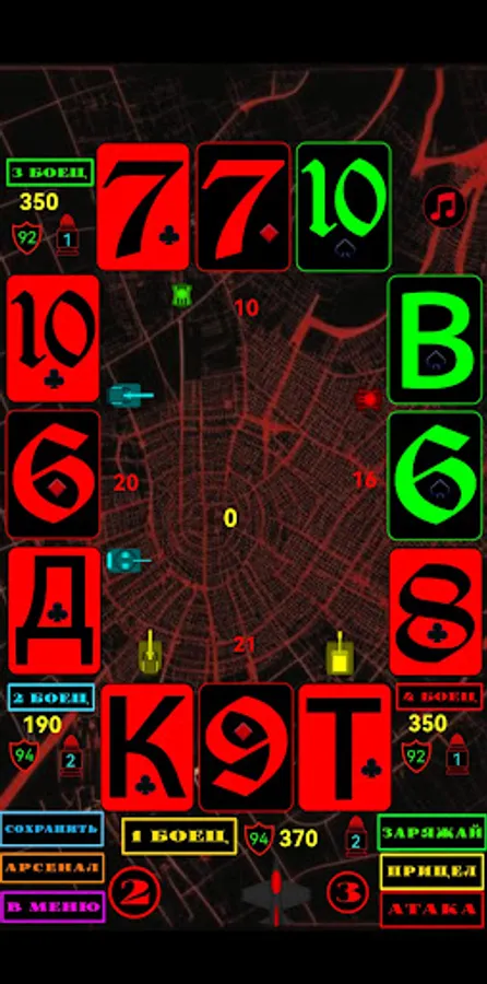 Игра с моими правилами. Четыре игрока сдают по три карты. У кого больше на руках, тот и победил бой. После раздачи вы можете удвоить или утроить банк. Если несколько игроков имеют одинаковые очки, больше, чем остальные, возникает конфликт. Игроки, организовавшие конфликт, не добавляют в банк, все остальные сообщают пол банка. После того, как карты сданы, банк берет большие очки на руках. Возможен следующий конфликт и т. д. Во время игры вы увеличиваете банк, необходимый для развития армии. Вы можете купить: оборону базы, увеличить ресурсы, увеличить урон. Кроме того, есть авиа удар по базам и удар по вражескому оружию.