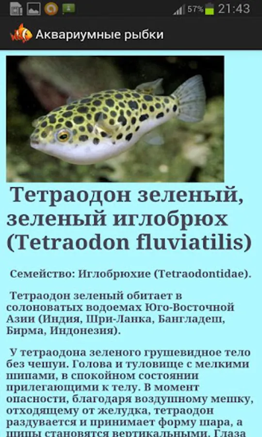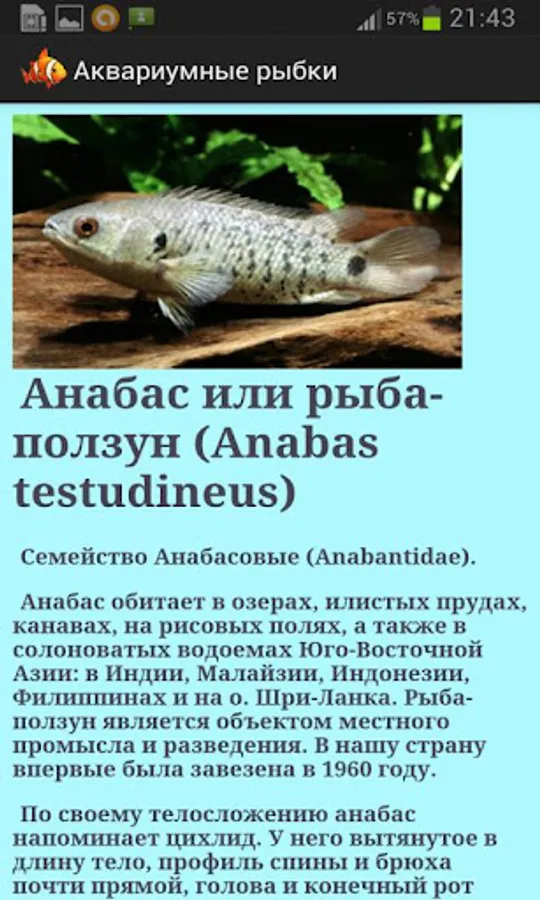 Description and photos of more than 200 types of aquarium hobbyists rybok.Uvazhaemye if you have found any errors in the application then email me (software provided), take the time to put a deuce. I do not have an aquarium, and I know nothing about fish. However, I will try to make the application as useful for you. Application of aquatic plants will also, but later.