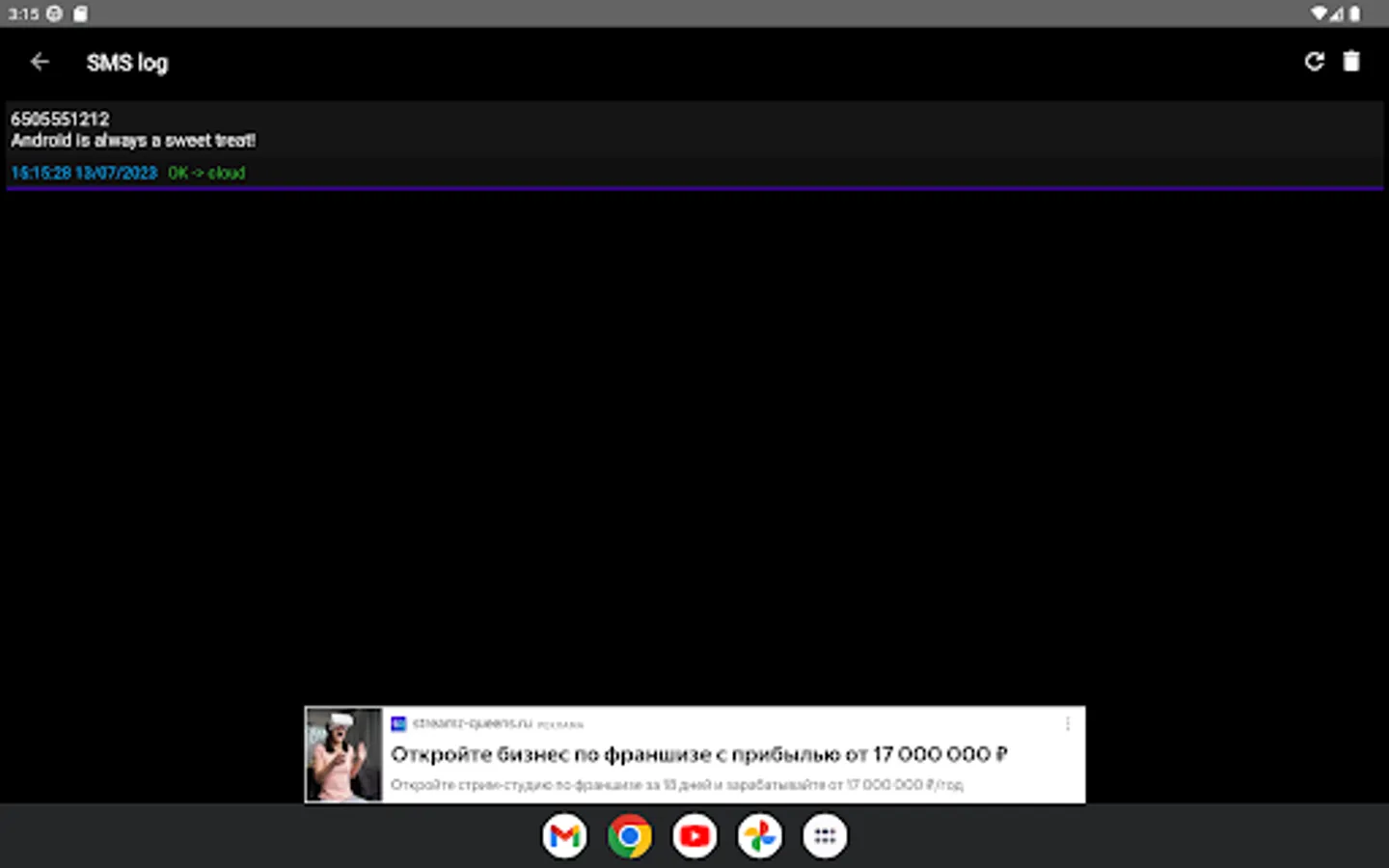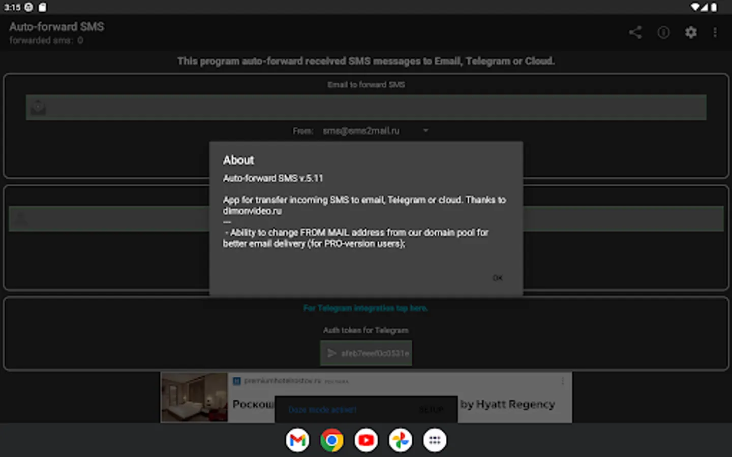 * This app is uploading users SMS Log information to http://sms2mail.net (https://sms.dimonvideo.net for version below 5.09) - this is needed to send SMS to your given email or Telegram account;