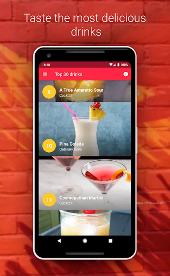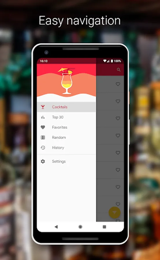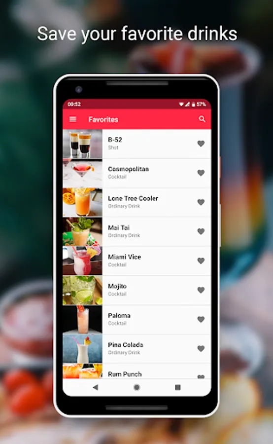 - Favorite drinks. Each liked drink will be stored in the favorites section