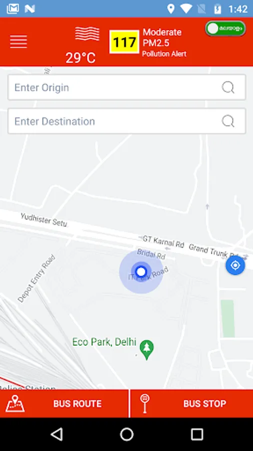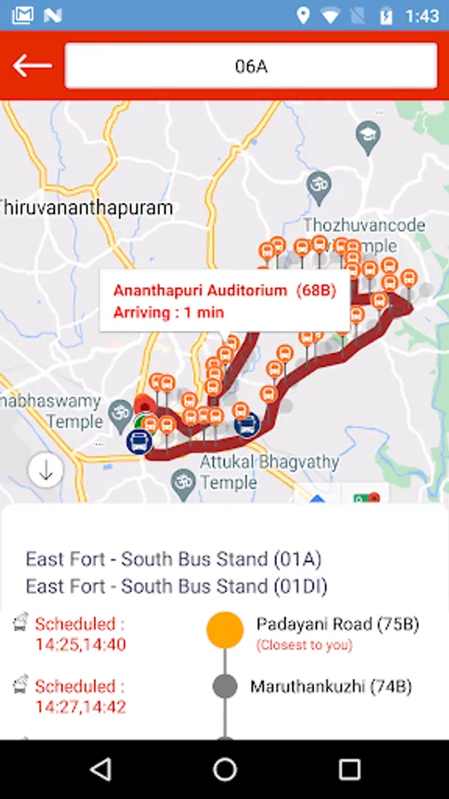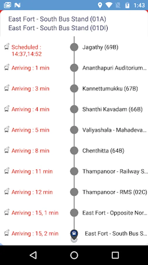 • Route Details: Shows the bus stops on the route and on clicking the bus stop, shows the ETA of the bus on that stop.