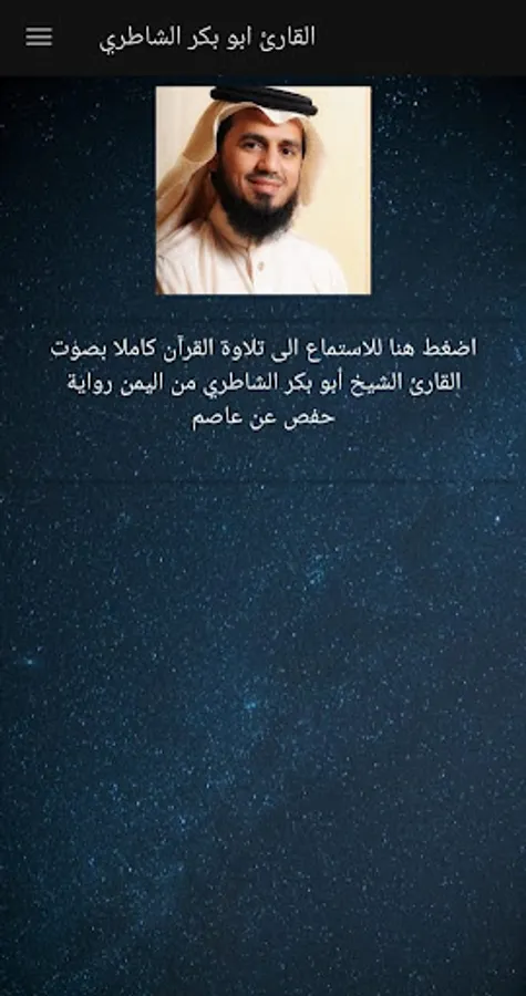إن كنت من محبي الاستماع لتلاوة القران الكريم بصوت القارئ الشيخ أبوبكر الشاطري فإن التطبيق بصوت أبوبكر الشاطري يوفر لك الاستماع بصوت أبوبكر الشاطري mp3 بصوت نقي.