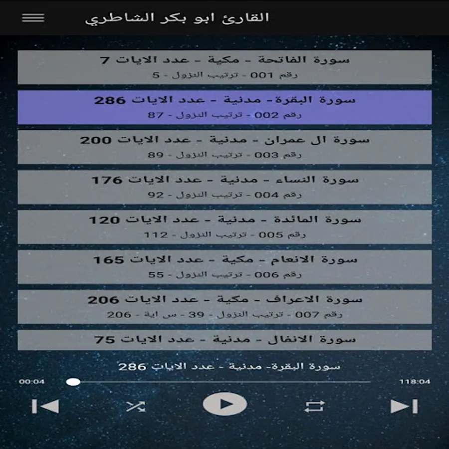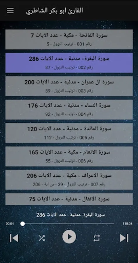 بمجرد الانتهاء من التلاوة يقوم التطبيق بعمل تشغيل للسورة التالية دون الحاجة إلي اختيار السورة بصوت أبوبكر الشاطري