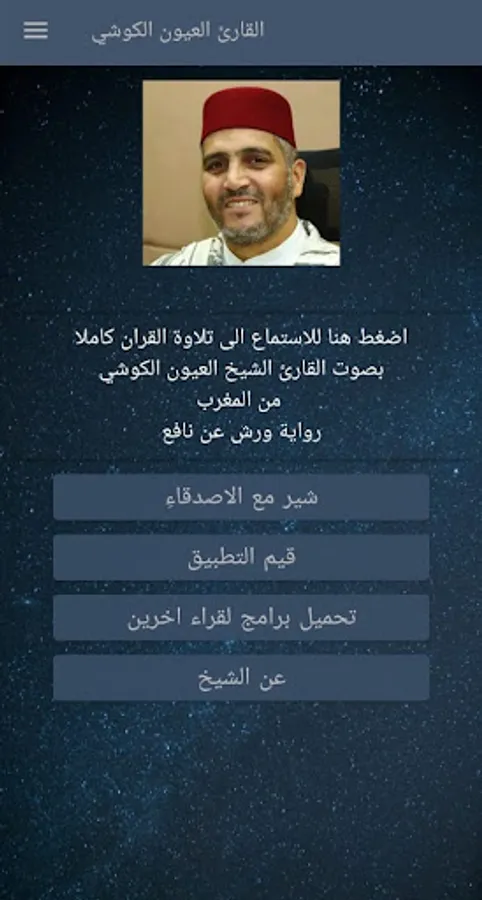 يتيح تطبيق القرآن الكريم بصوت الشيخ العيون الكوشي سماع سور القرآن الكريم كافة من خلال الهاتف المحمول - النقال.