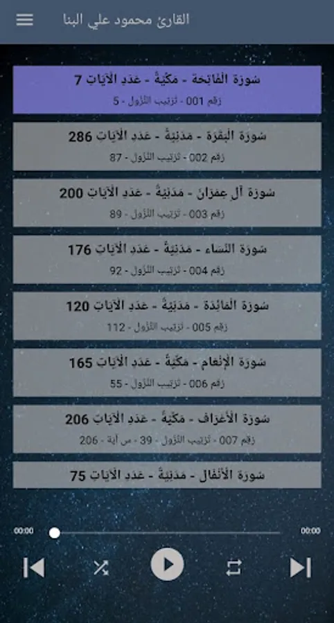 بمجرد الانتهاء من التلاوة يقوم التطبيق بعمل تشغيل للسورة التالية دون الحاجة إلي اختيار السورة بصوت محمود علي البنا