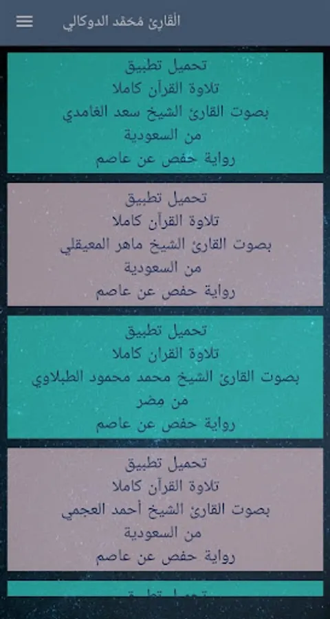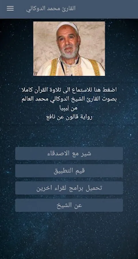 يتيح تطبيق القرآن الكريم بصوت الشيخ الدوكالى محمد العالم سماع سور القرآن الكريم كافة من خلال الهاتف المحمول - النقال
