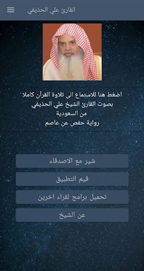إذا أعجبك تطبيق تحميل القرآن الكريم بصوت الشيخ علي الحذيفي فنرجو التقييم للتطبيق
