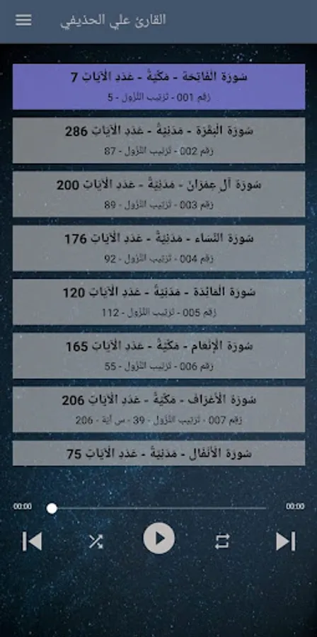 بمجرد الانتهاء من التلاوة يقوم التطبيق بعمل تشغيل للسورة التالية دون الحاجة إلي اختيار السورة بصوت علي الحذيفي