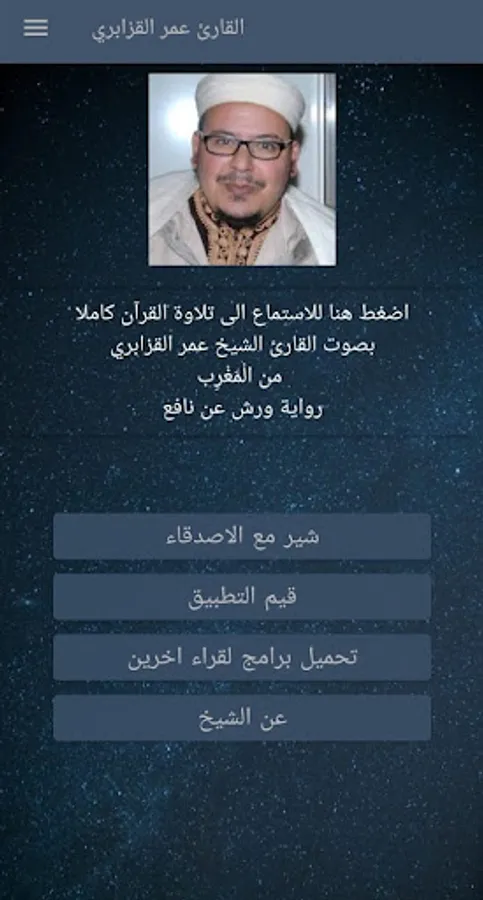 يتيح تطبيق القرآن الكريم بصوت الشيخ عمر القزابري سماع سور القرآن الكريم كافة من خلال الهاتف المحمول - النقال.