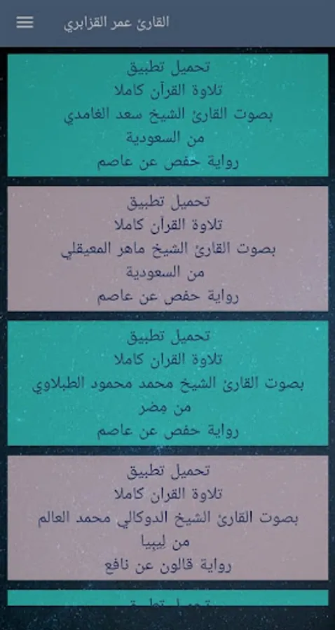 إن كنت من محبي الاستماع لتلاوة القران الكريم بصوت القارء الشيخ عمر القزابري فإن التطبيق بصوت عمر القزابري يوفر لك الاستماع بصوت عمر القزابري mp3 بصوت نقي.