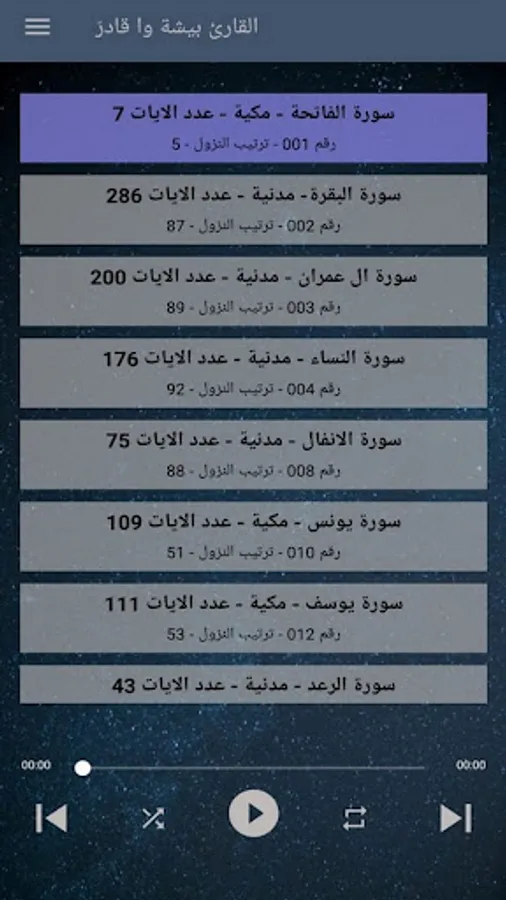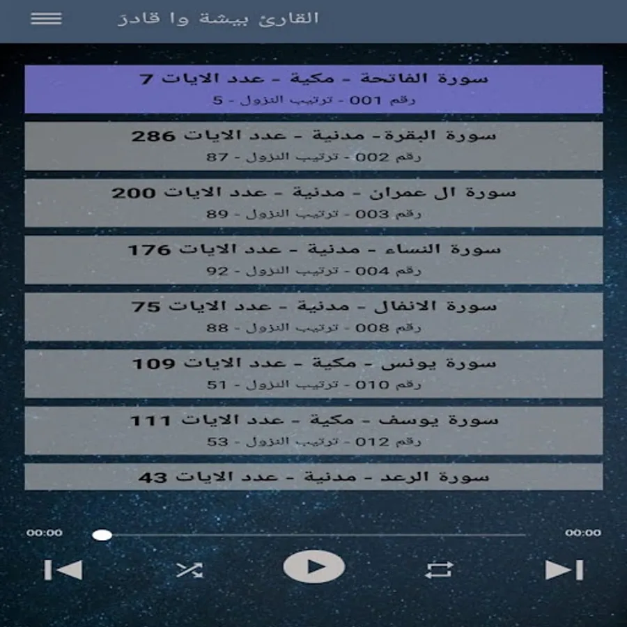 بمجرد الانتهاء من التلاوة يقوم التطبيق بعمل تشغيل للسورة التالية دون الحاجة إلي اختيار السورة بصوت بيشة وا قادر