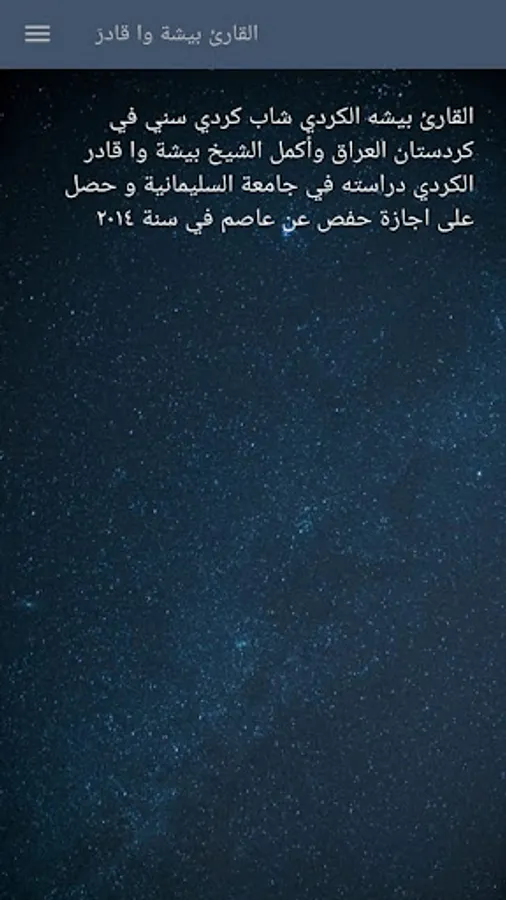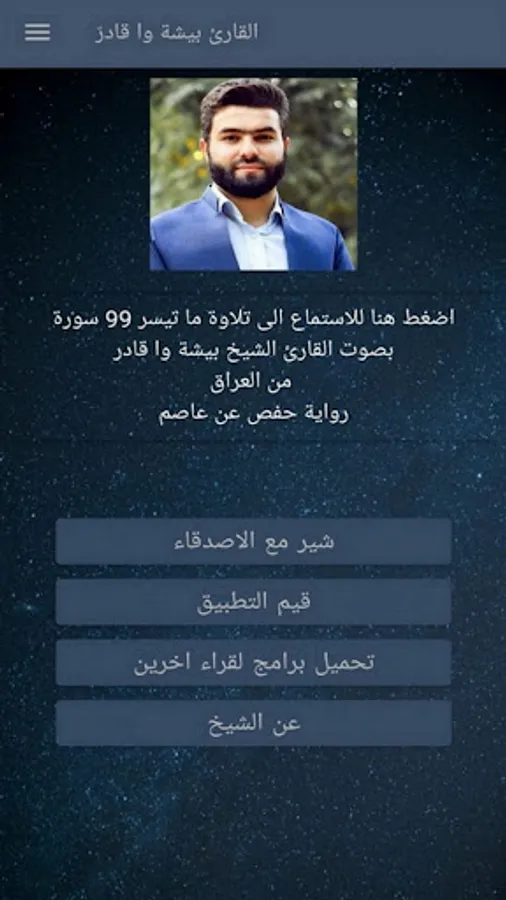إن كنت من محبي الاستماع لتلاوة القران الكريم بصوت القارء الشيخ بيشة وا قادر فإن التطبيق بصوت بيشة وا قادر يوفر لك الاستماع بصوت بيشة وا قادر mp3 بصوت نقي.