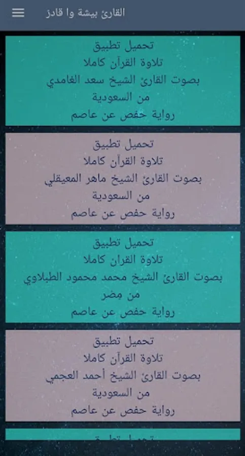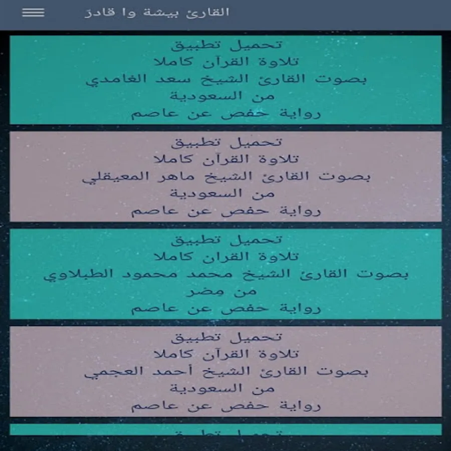 يتيح تطبيق القرآن الكريم بصوت الشيخ بيشة وا قادر سماع سور القرآن الكريم كافة من خلال الهاتف المحمول - النقال.
