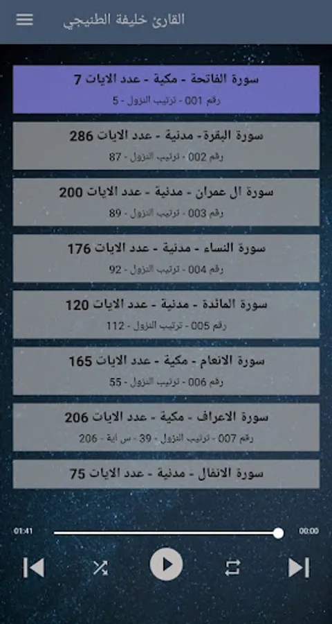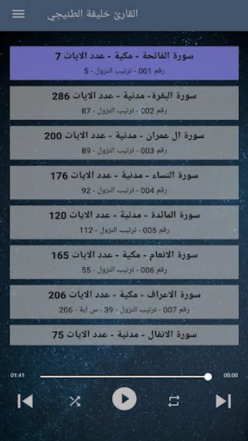 بمجرد الانتهاء من التلاوة يقوم التطبيق بعمل تشغيل للسورة التالية دون الحاجة إلي اختيار السورة بصوت خليفة الطنيجي