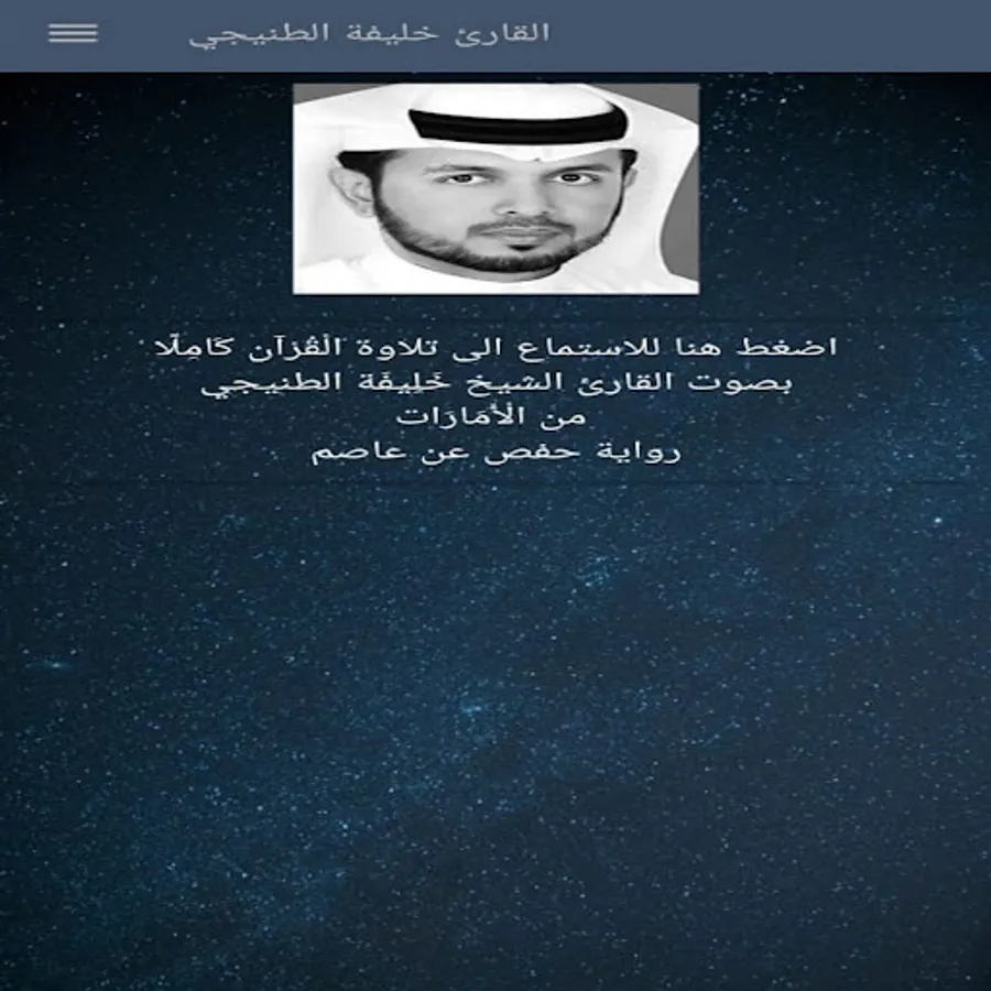 إن كنت من محبي الاستماع لتلاوة القران الكريم بصوت القارئ الشيخ خليفة الطنيجي فإن التطبيق بصوت خليفة الطنيجي يوفر لك الاستماع بصوت خليفة الطنيجي mp3 بصوت نقي.