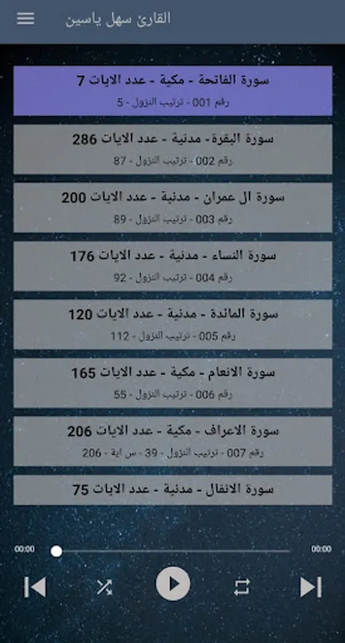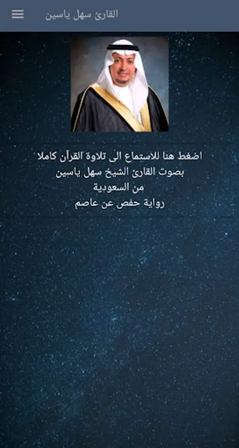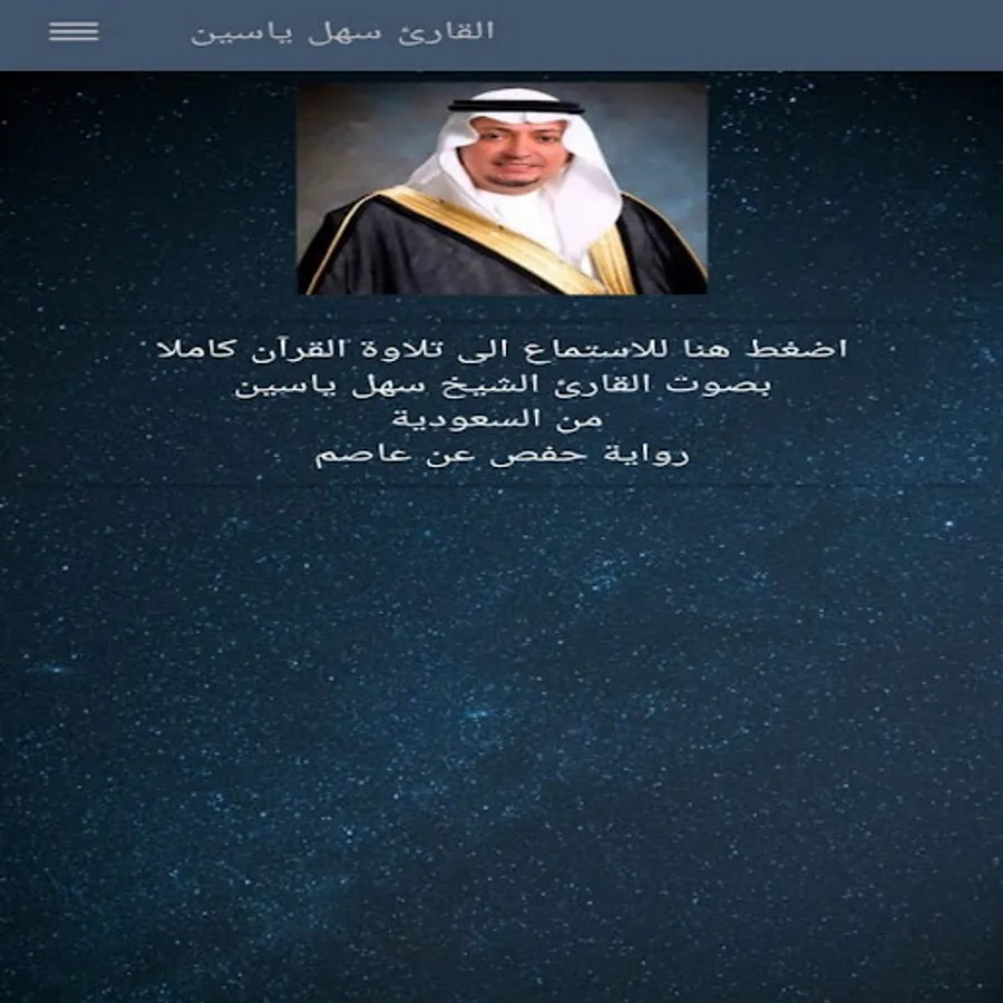يتيح تطبيق القرآن الكريم بصوت الشيخ سهل ياسين سماع سور القرآن الكريم كافة من خلال الهاتف المحمول - النقال.
