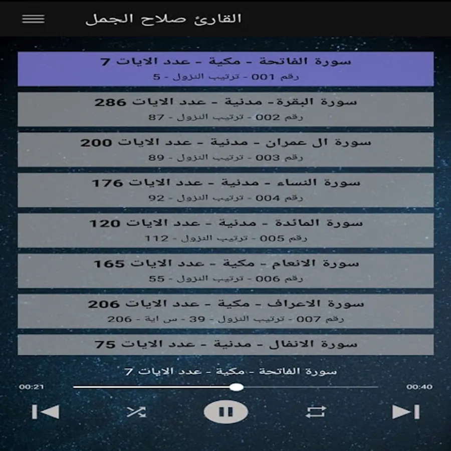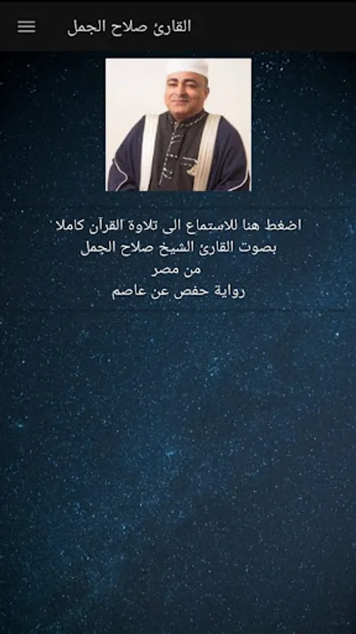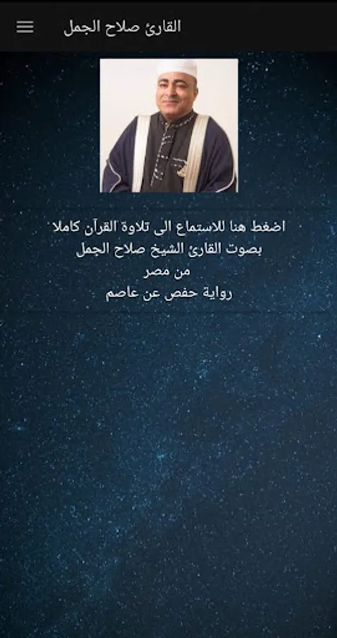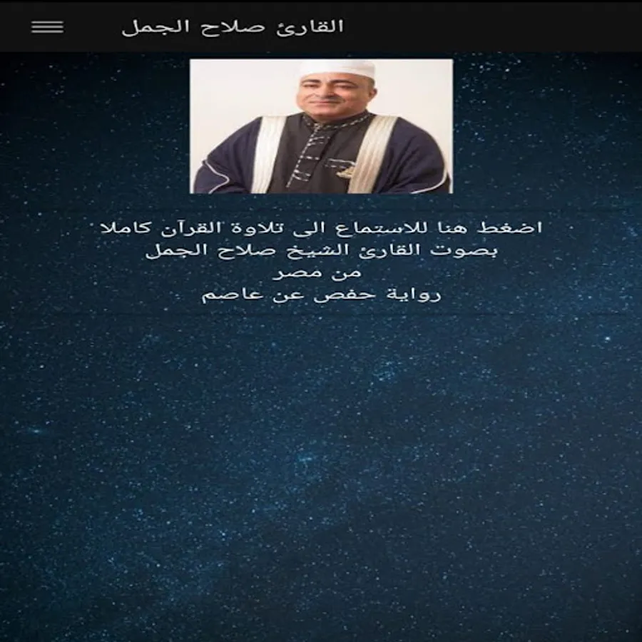 يتيح تطبيق القرآن الكريم بصوت الشيخ صلاح الجمل سماع سور القرآن الكريم كافة من خلال الهاتف المحمول - النقال.