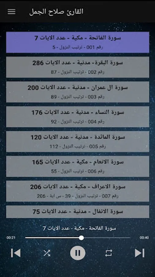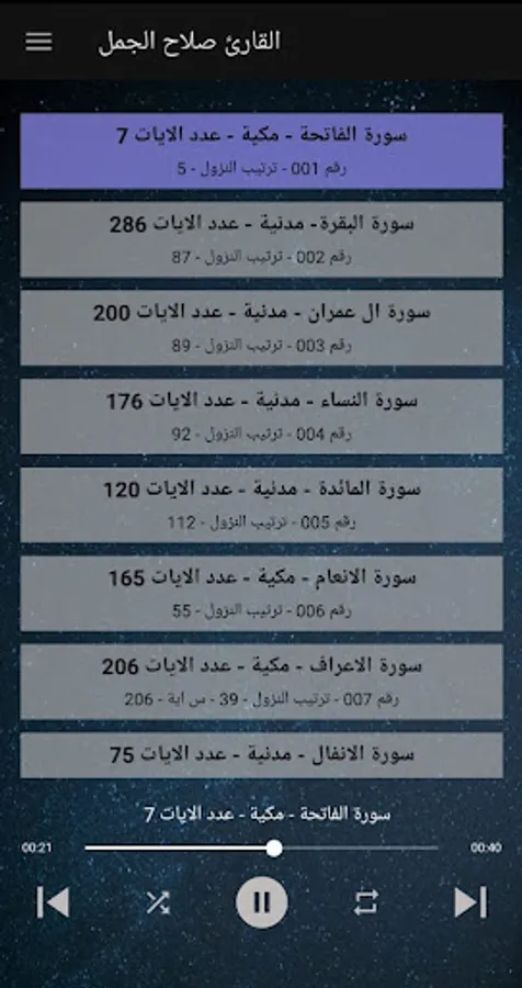 بمجرد الانتهاء من التلاوة يقوم التطبيق بعمل تشغيل للسورة التالية دون الحاجة إلي اختيار السورة بصوت صلاح الجمل