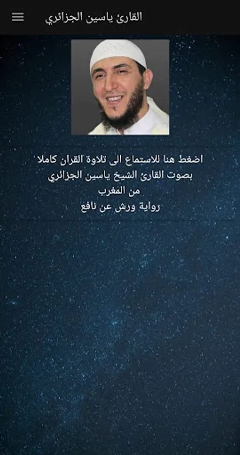 يتيح تطبيق القرآن الكريم بصوت الشيخ ياسين الجزائري سماع سور القرآن الكريم كافة من خلال الهاتف المحمول - النقال.