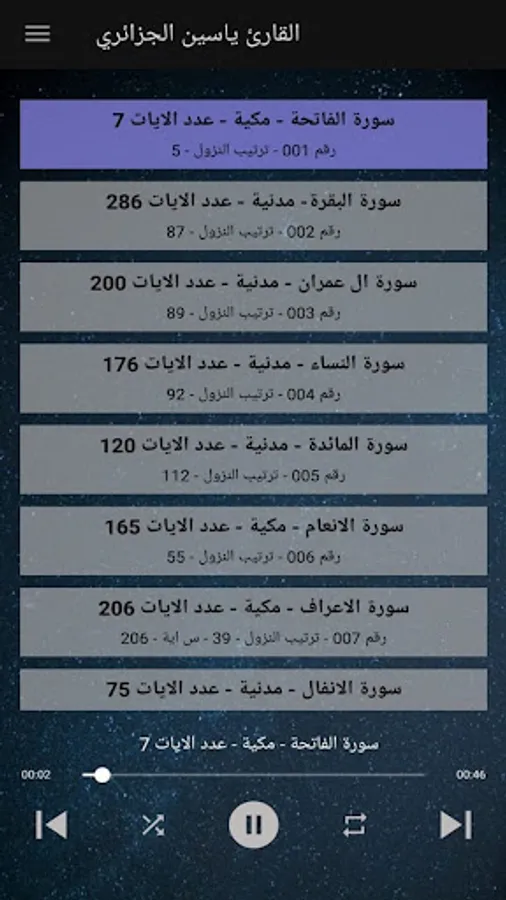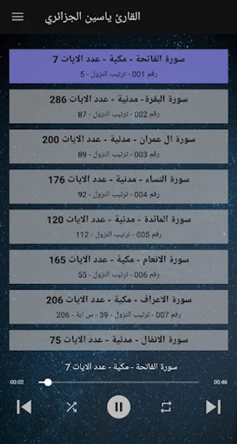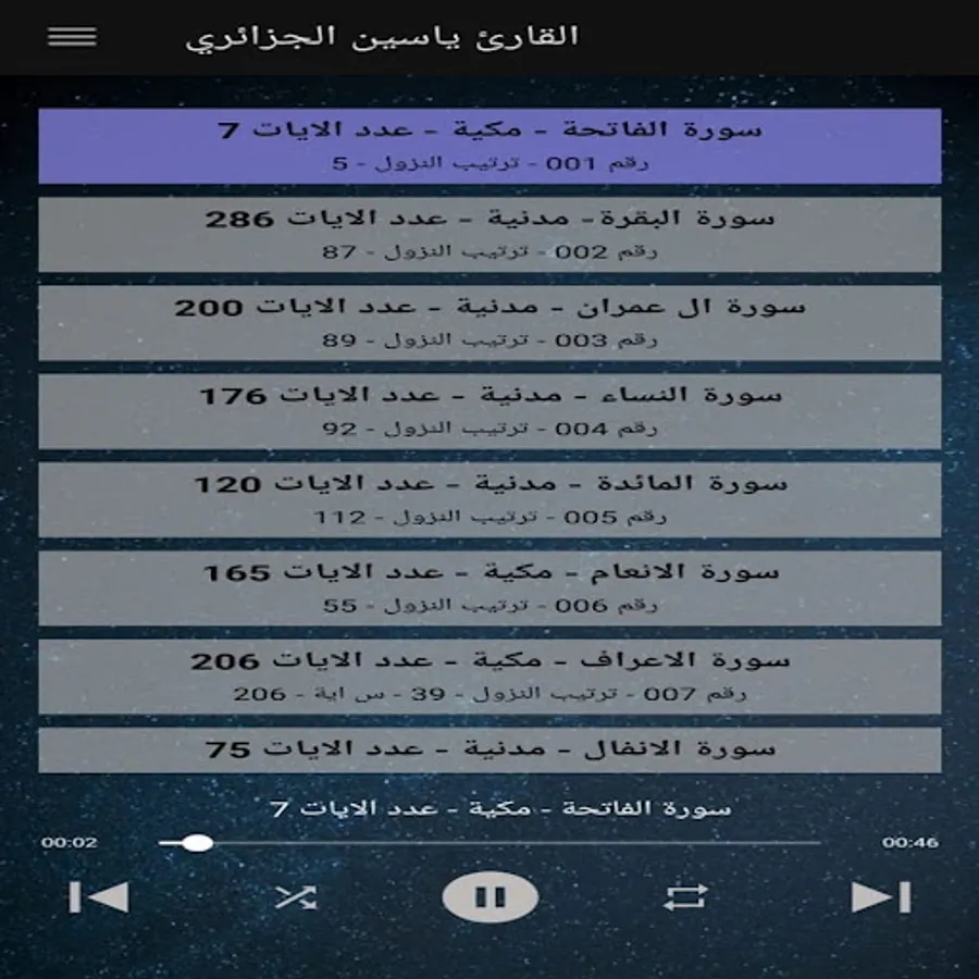 بمجرد الانتهاء من التلاوة يقوم التطبيق بعمل تشغيل للسورة التالية دون الحاجة إلي اختيار السورة بصوت ياسين الجزائري