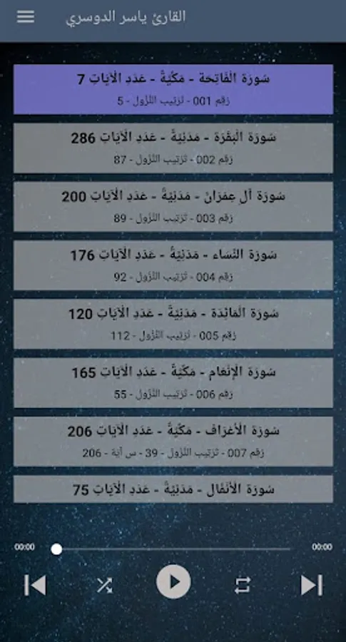 بمجرد الانتهاء من التلاوة يقوم التطبيق بعمل تشغيل للسورة التالية دون الحاجة إلي اختيار السورة بصوت ياسر الدوسري