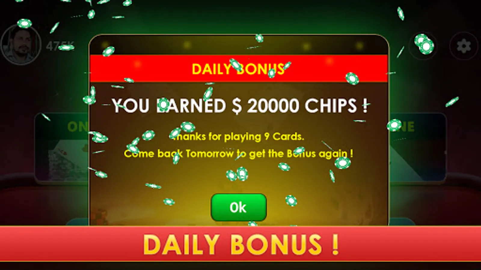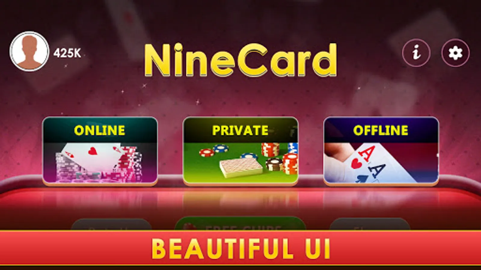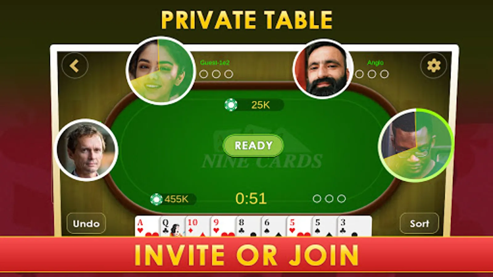 Invite your Friends and Family and play with them on Private Tables. Don’t have the internet? You can always play offline. Play Nine Cards with friends on Hotspot/Wifi.