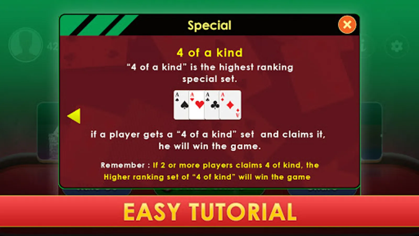 Four of kind is a special card set. Any player who gets four of a kind wins the game immediately. but other players can also claim the game if they have four of a kind with a higher value.