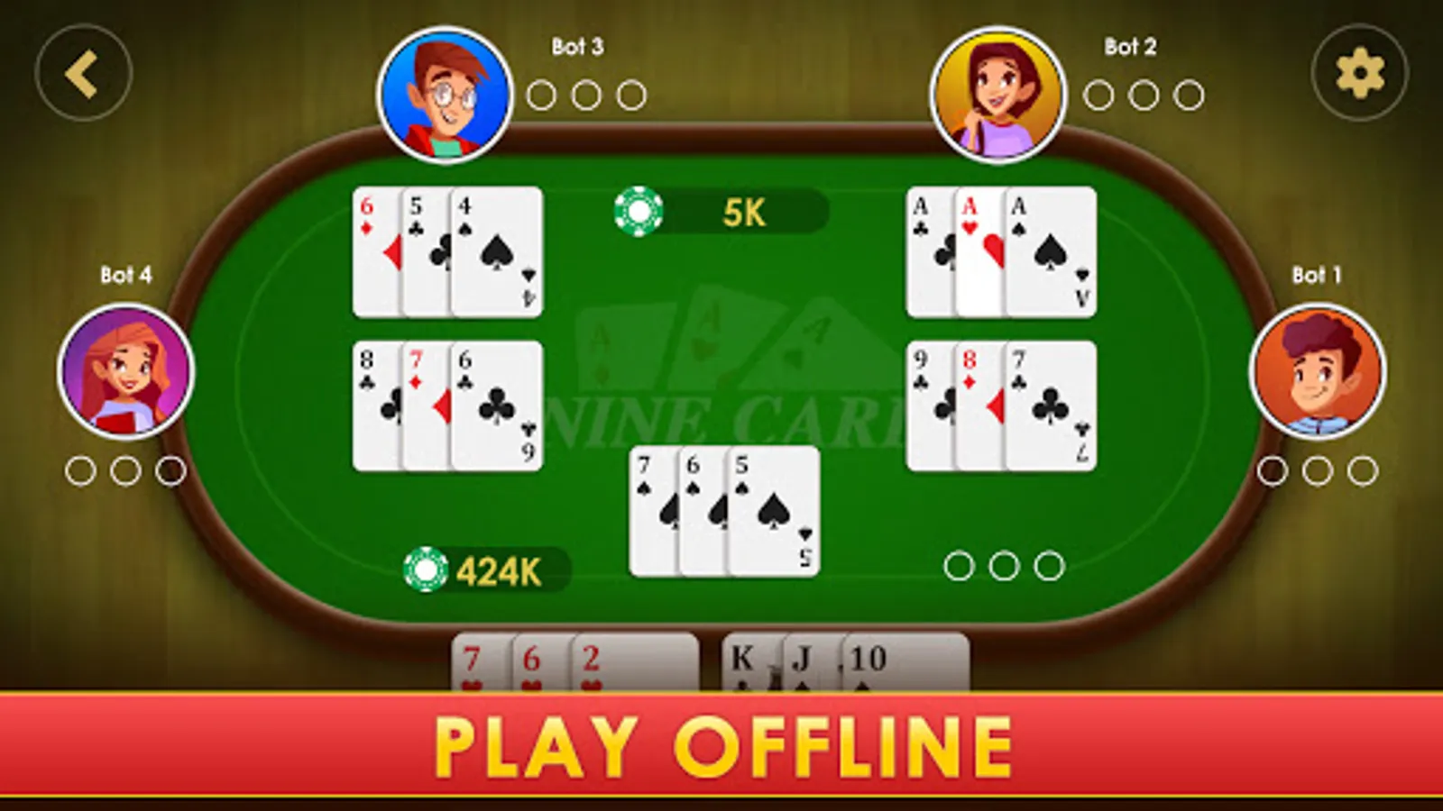 Nine Cards is a card game played by 2 to 5 players. Nine Cards or 9 Patti can be played by up to five people. Winning depends on your cards and moves. This is very much like Teen Patti but played in 3 sequences. The player who achieves 2 out of 3 sets wins the game. Kitti is a popular game with multiplayer features in a closed network. It is variations of real teen Patti a popular Indian card game.