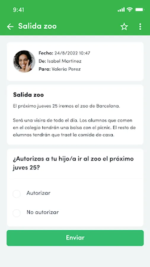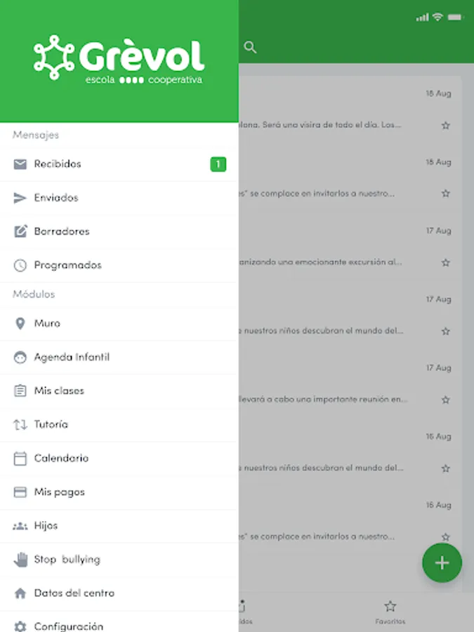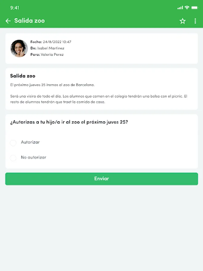 It is a two-way communication channel, the center can send messages to families and students, and they can also send messages to the facilitating center, if necessary, files attached (PDF, photos, videos, sort authorizations, etc.).