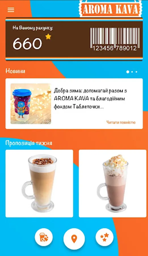 The APP Aroma Kava - it’s a convenient way to receive bonuses for your purchases in the coffeehouse chain Aroma Kava. For each purchase, you will receive "stars", which can be exchanged for delicious free drinks and meals in Aroma Kava. The APP also helps you to find the nearest café and their work schedule, the history of charging and writing off bonuses and view the actual menu.