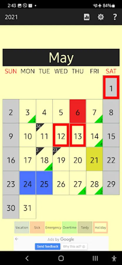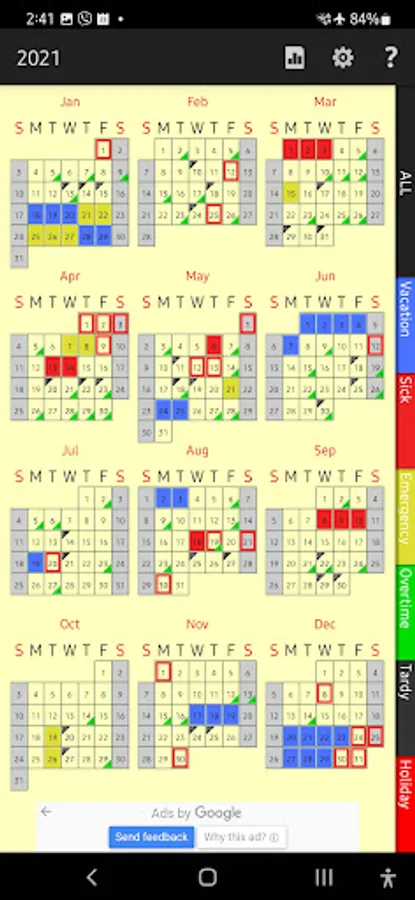 - Emergency Leaves, whole day & half day (Yellow)