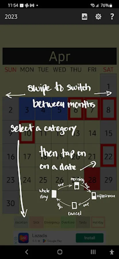 - Sick Leaves, whole day & half day (Red)