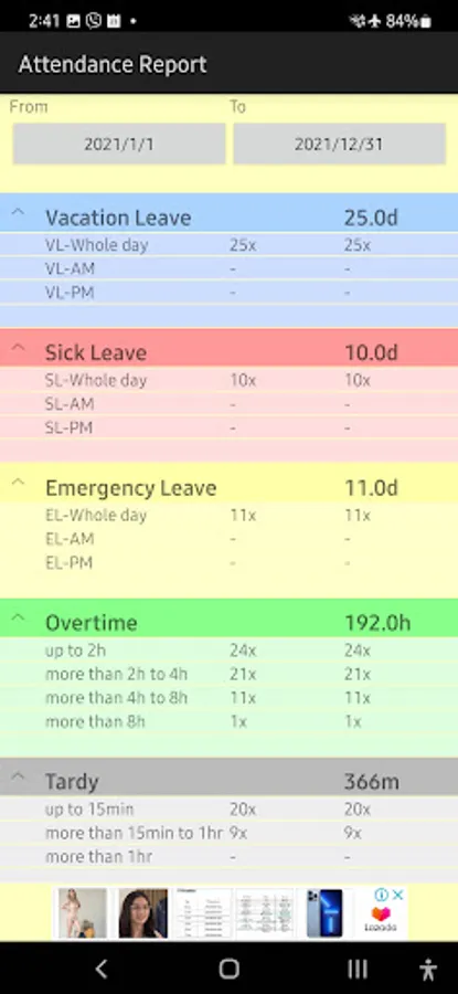 The following attendance and leave information are tracked by the app: