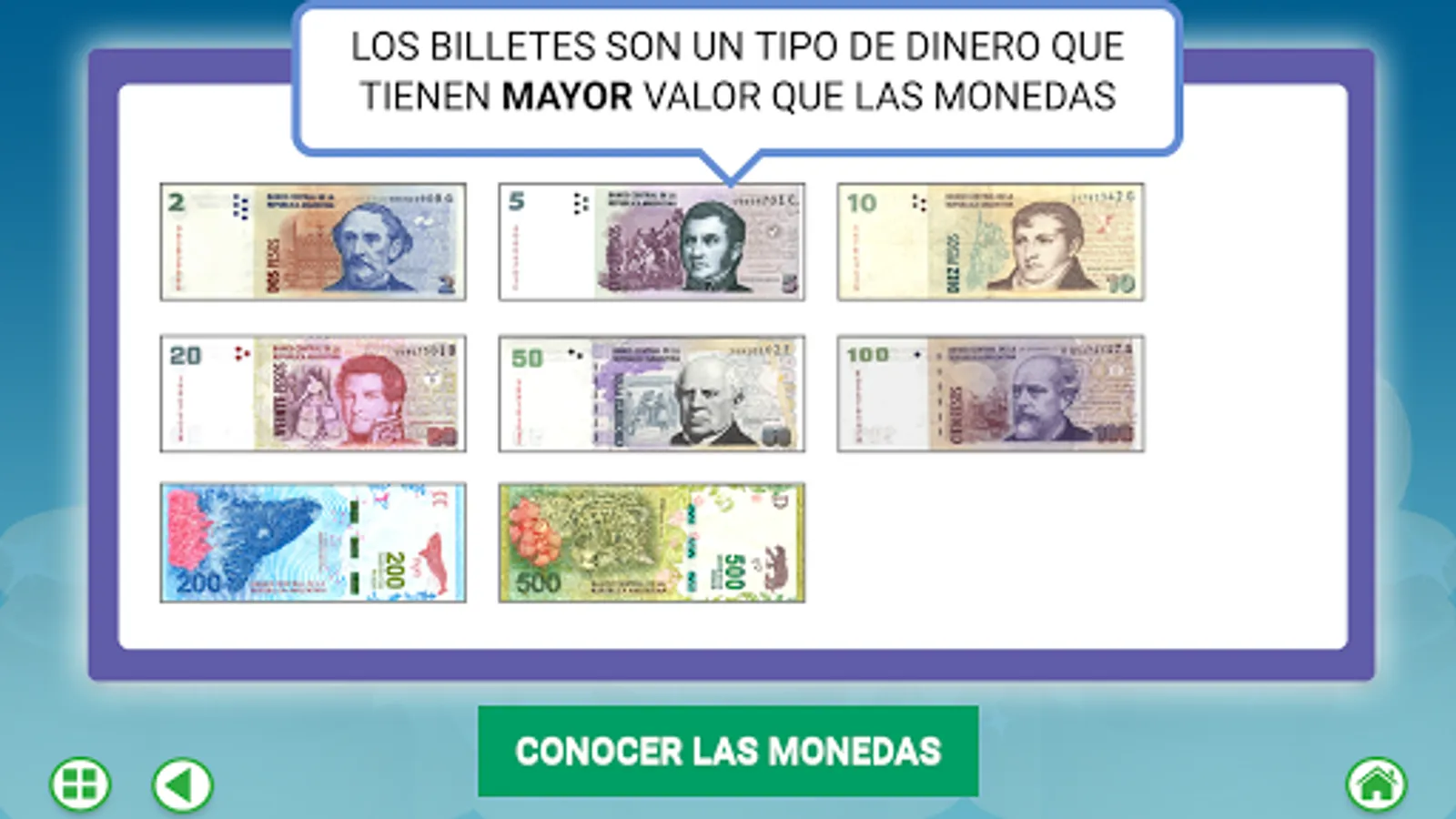 More information: This is an application specifically designed to teach money from Argentina, The application features audio that allows you to learn the characteristics of each banknote and coin and start identifying them. It also presents situations to identify whether a particular bill reaches or not to purchase a certain product of a certain value, which notes or coins can buy a product without receiving back. In the last level situations to purchase one or more products with the ability to calculate the change that would be received are presented.