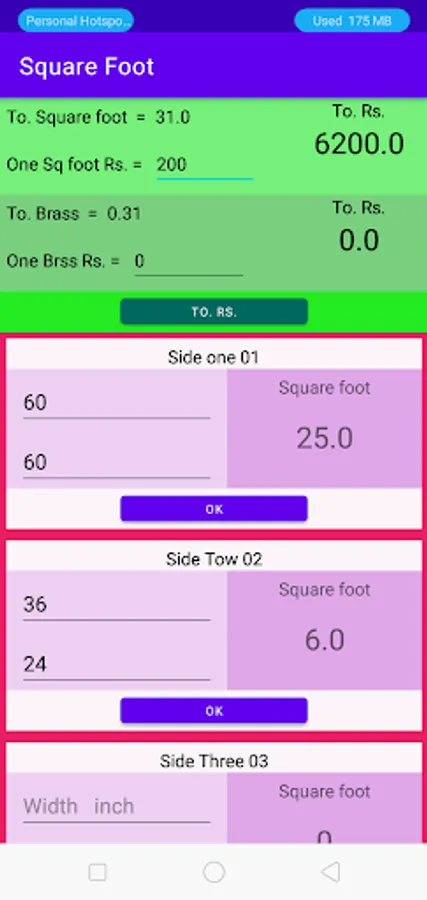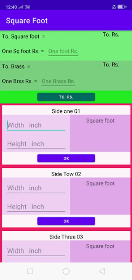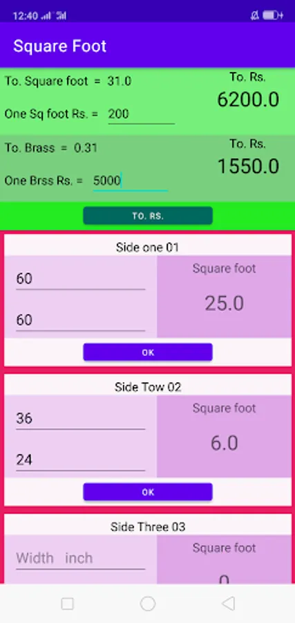 Just write in inches in length and inches in width and get Total Square Feet and Total Brass and write the price once and get total income,