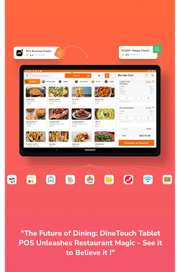 DineTouch is the Android point-of-sale app for Managing your Food and Beverage Business. It runs on top of DineConnect Suite (Complete SAAS Module to manage Products, Inventory, Stock, Suppliers, Productions, etc.) that gives you everything you need to take payments and run your business.