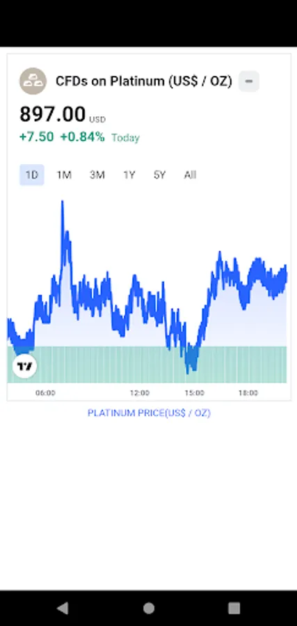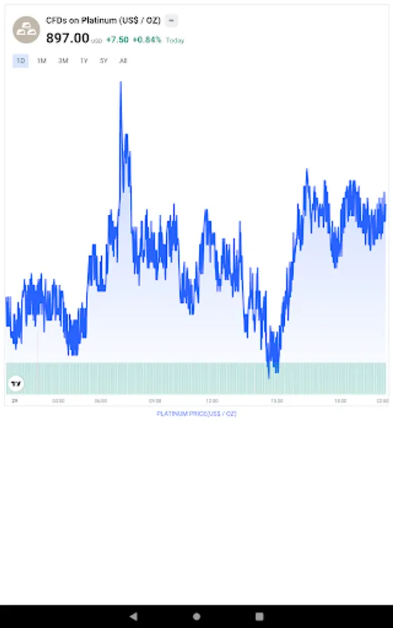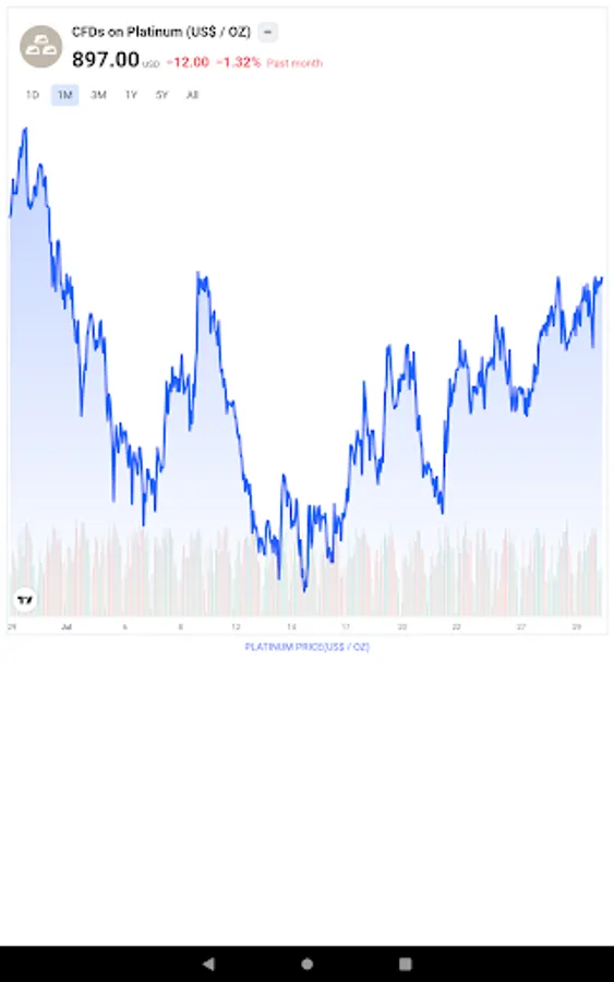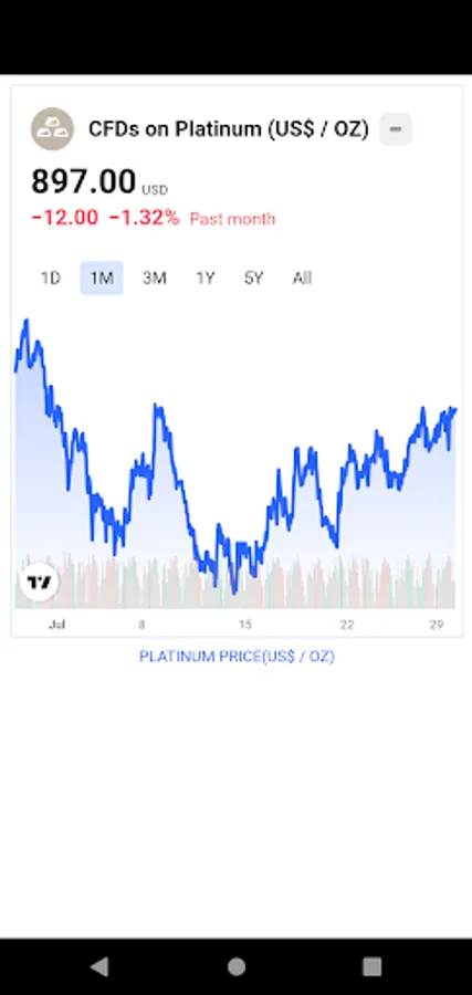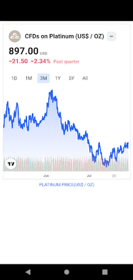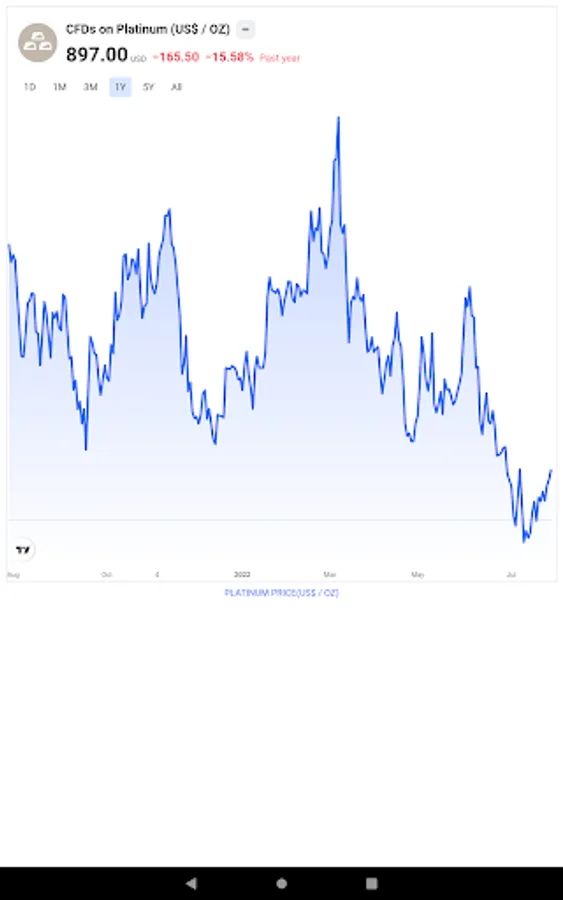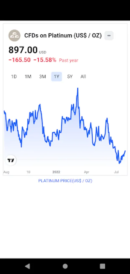 Easily get latest price of platinum, from this easy-to-use app which delivers the price together with use price graphs so you can see the price fluctuations over the course of last day, week, month, year or 5 years.