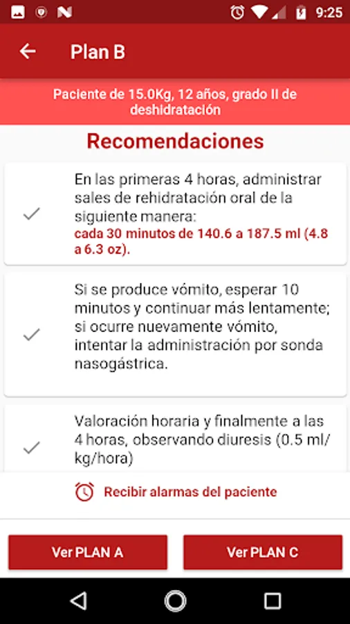 The design of this application responds only to genuine scientific interest to supply the pediatric community a tool of medical technology innovation to enable a user to perform various calculations regarding a child or dehydrated child; with special features that make it unique, intended for smartphone type phones and tablets. For any reason, seeks to replace the result of a judicious clinical practice, traditional medical approach based on existing traditional semiológica correlation between anamnesis and complete physical examination; Therefore, the user of this application, you need individual variables beyond this tool features, seeking to provide the small patient afflicted with any degree of dehydration, an appropriate personalized therapeutic approach according to each clinical case in particular, which may include use other additional sources of information. Therefore, the user is responsible for the use of this app and clinical results obtained with its use.